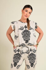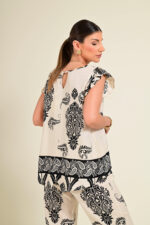 Με αέρινη εφαρμογή και φίνα υφή, προσδίδει μια αίσθηση χαλαρής πολυτέλειας. Τα διακριτικά βολάν στα μανίκια και το minimal μοτίβο σε ασπρόμαυρους τόνους την καθιστούν μια εξαιρετική επιλογή για κάθε περίσταση. Φορέστε τη με λευκό παντελόνι για μια δροσερή καλοκαιρινή εμφάνιση ή με μαύρη φούστα για μια πιο βραδινή επιλογή. Συνδυάζεται υπέροχα με λεπτά κοσμήματα και μίνιμαλ αξεσουάρ για ένα refined look.