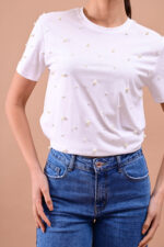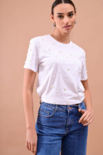 Κοντομάνικη μπλούζα με διακοσμητικές πέρλες στη μπροστινή όψη και στρογγυλή λαιμόκοψη.
