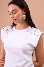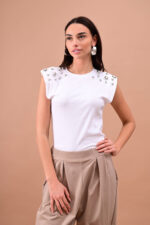 Αμάνικη μπλούζα με διακοσμητικά μεγάλα τρουξ στο πάνω μέρος και στρογγυλή λαιμόκοψη.