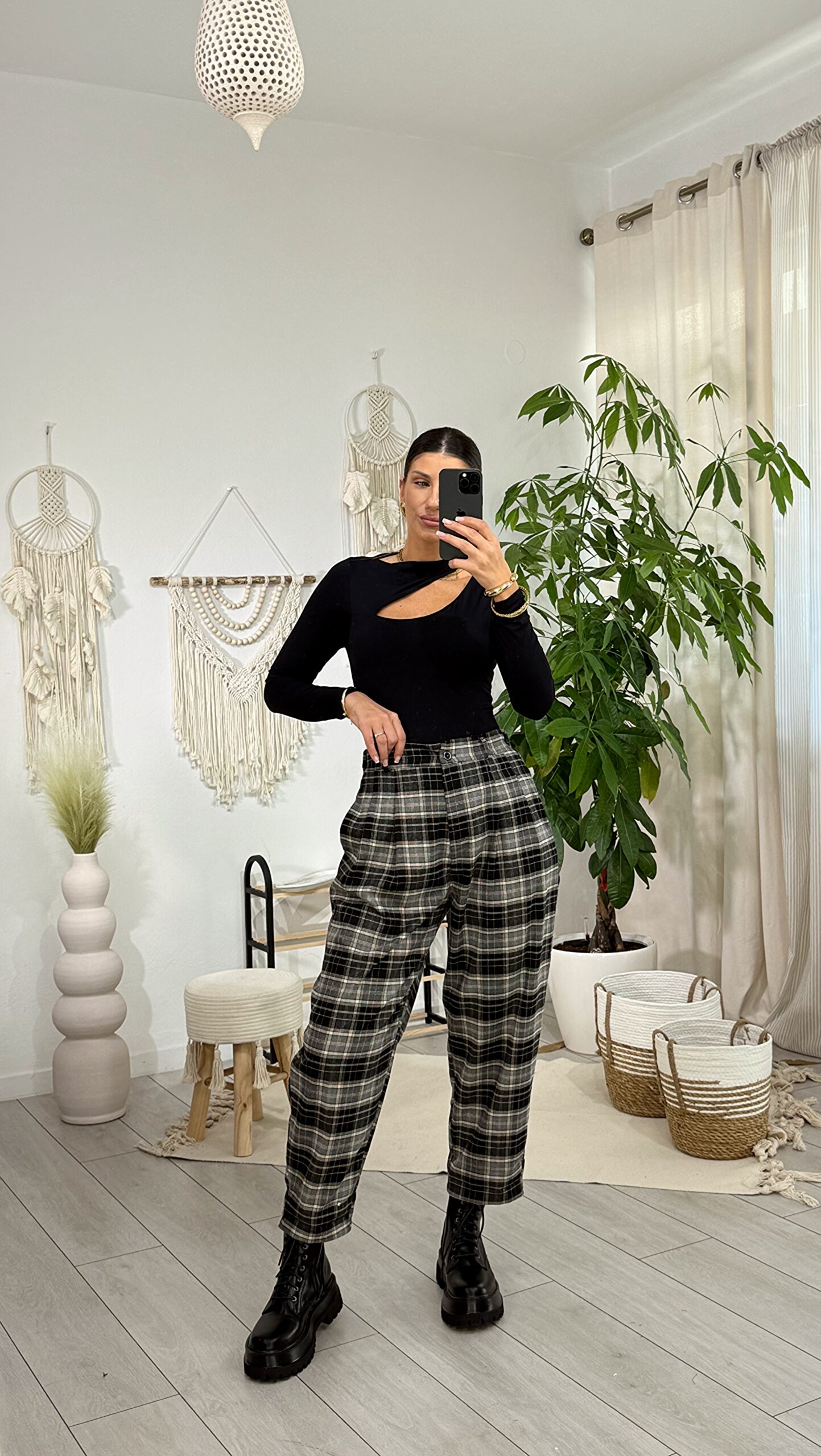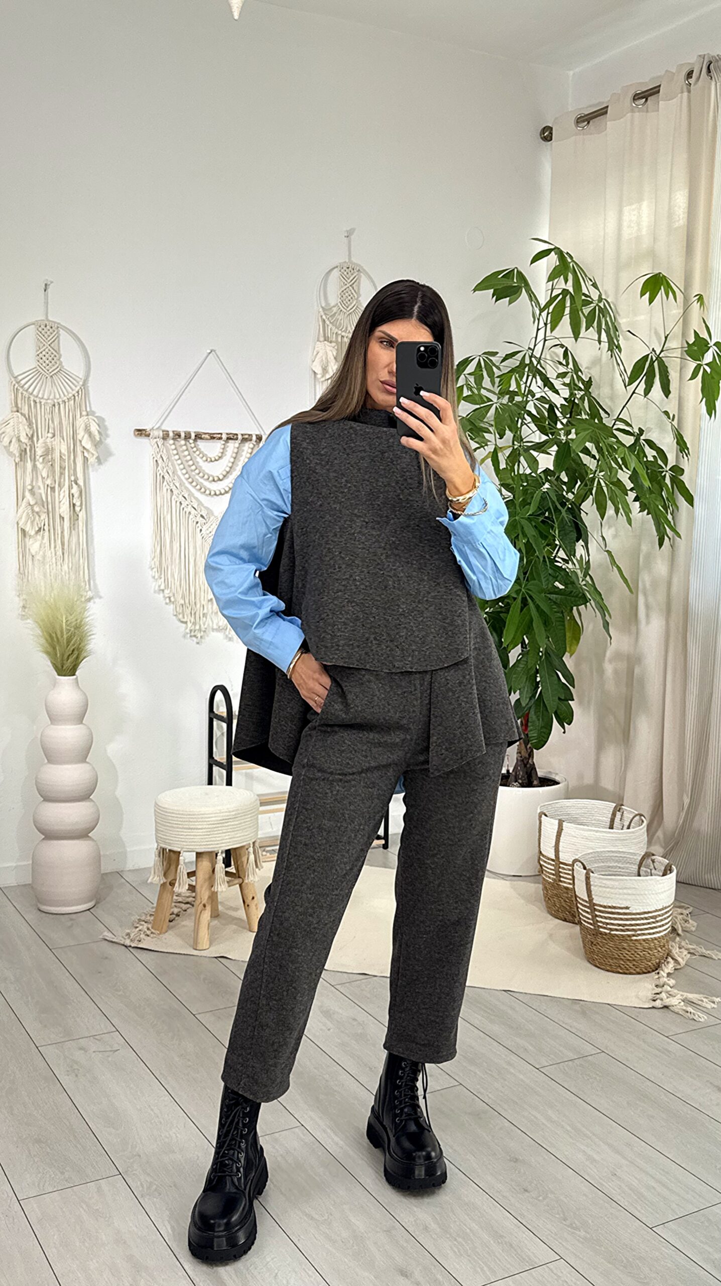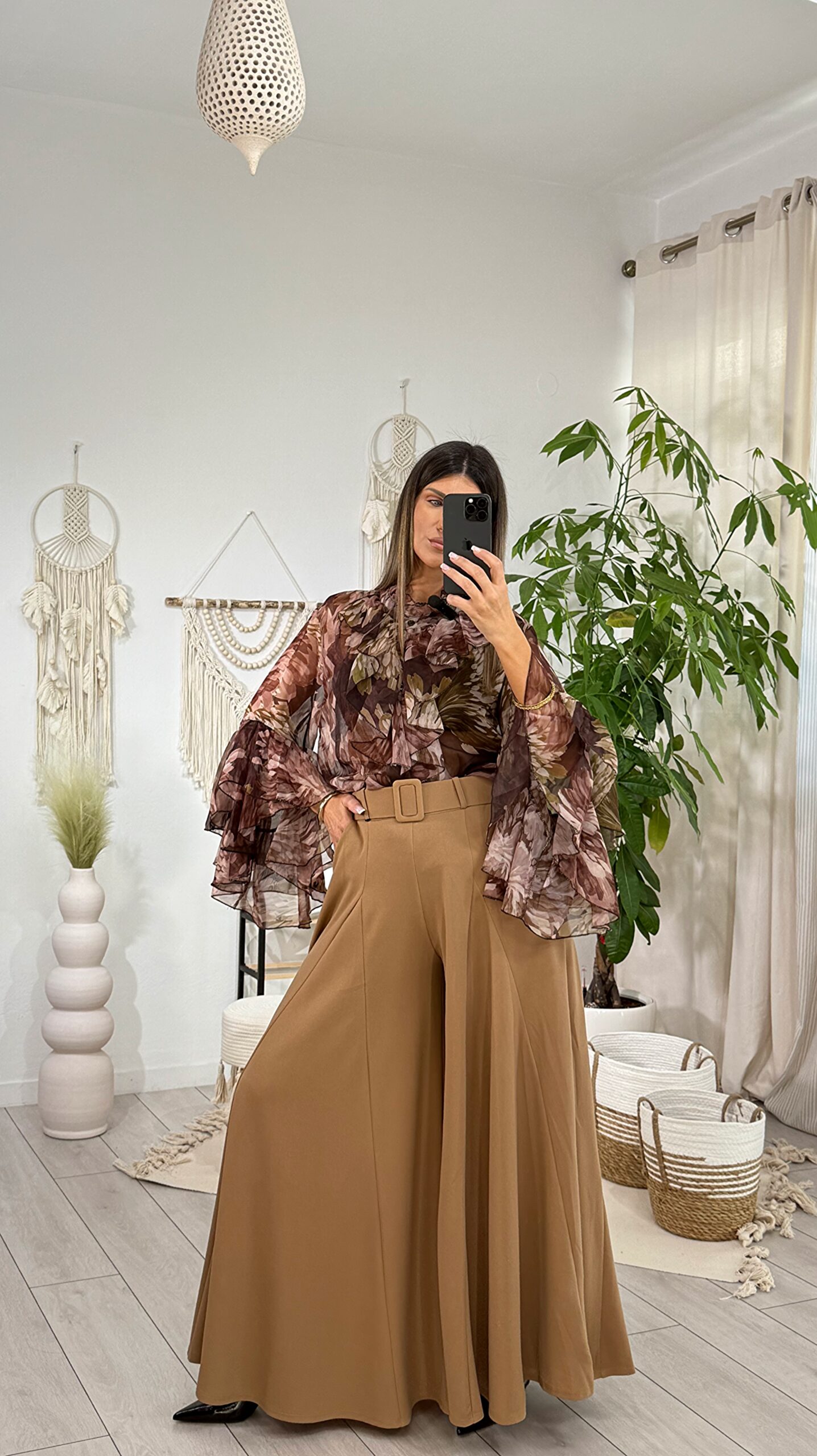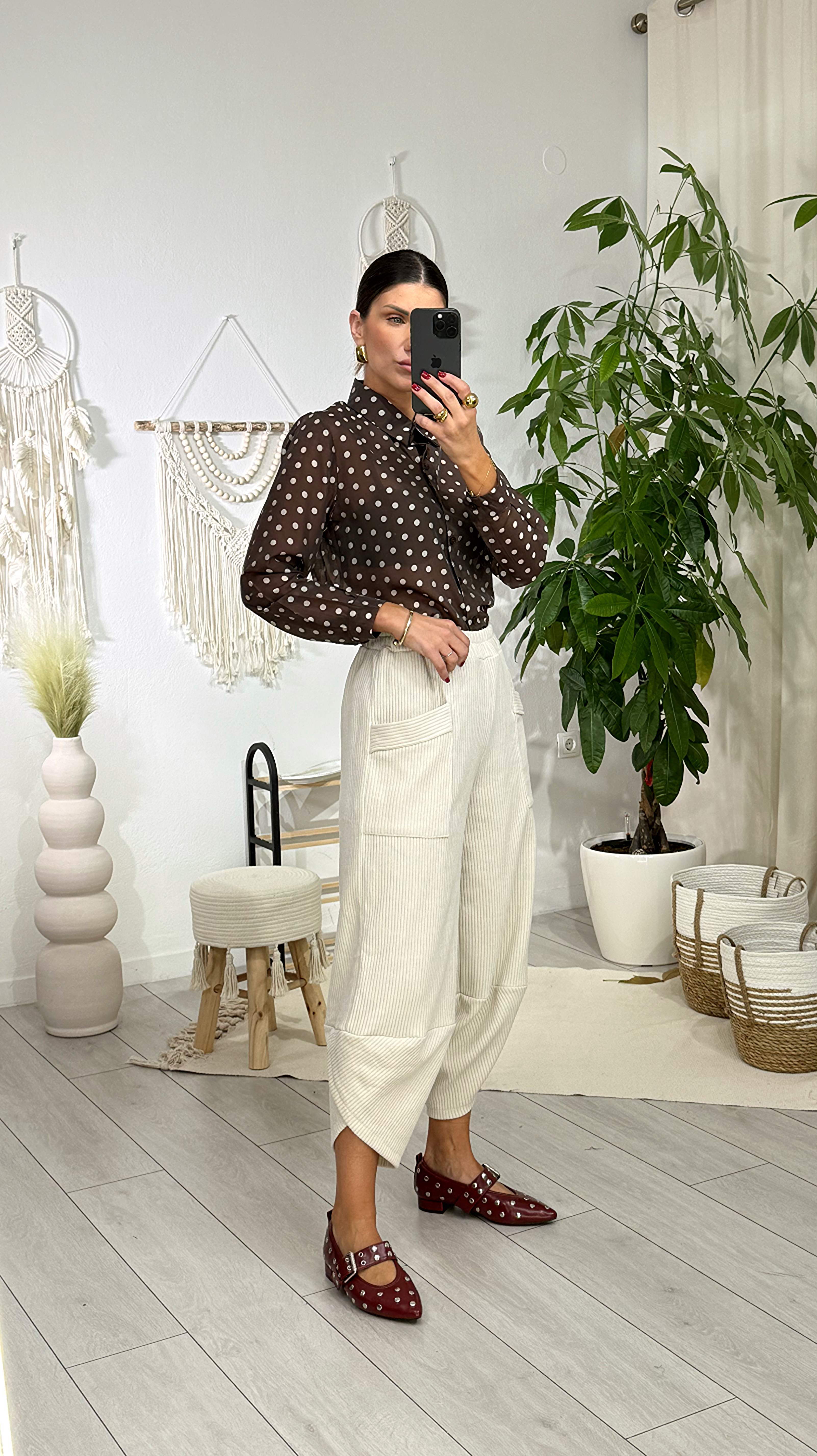 Μια παντελόνα που αναδεικνύει την κίνηση σαν φυσική συνέχεια του σώματος∙ οι απαλές πιέτες της δημιουργούν ρυθμό σε κάθε βήμα, ενώ η ψηλόμεση γραμμή της χαρίζει αίσθηση ισορροπίας και κομψότητας. Η ρευστή της φόρμα αποπνέει ελευθερία, χωρίς να χάνει τη δομή που της δίνει χαρακτήρα. Ένα κομμάτι που μπορεί να σταθεί απόλυτα μόνο του, αλλά και να μεταμορφωθεί ανάλογα με το ύφος που θέλεις να του δώσεις, αφήνοντας πάντα μια υπόσχεση διακριτικής θηλυκότητας.