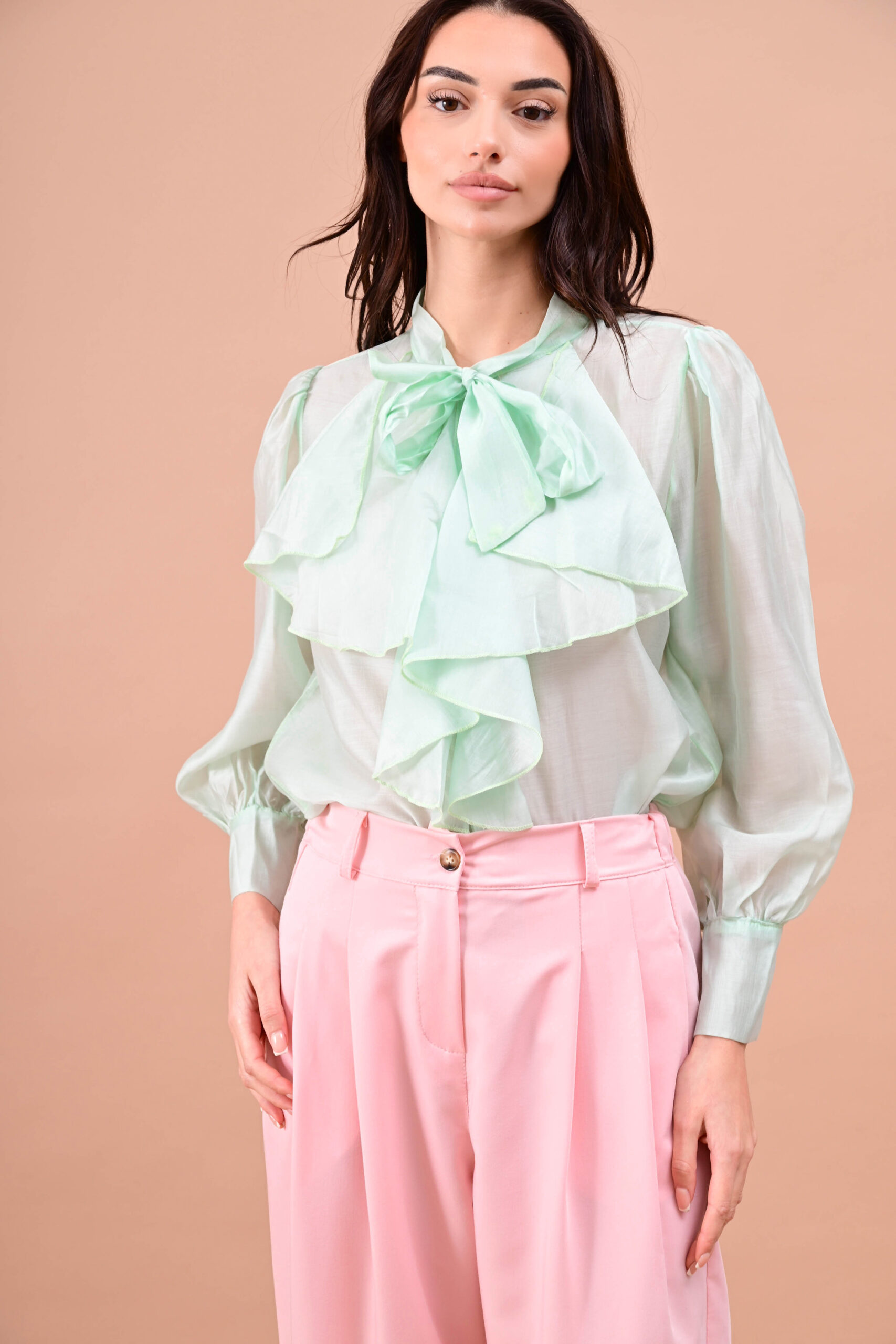 Πουκάμισο από ημιδιαφανές ύφασμα. Διαθέτει βολάν στο μπροστινό μέρος. Κουμπώνει με κουμπιά και δένει στο λαιμό.