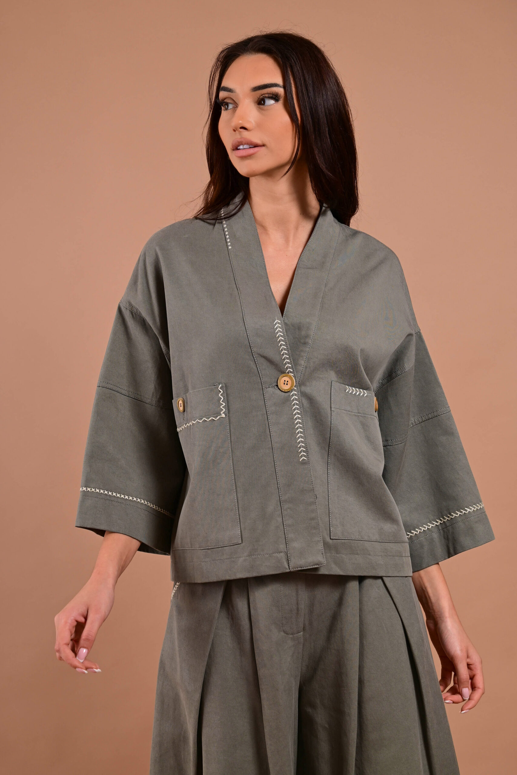 Τζάκετ σε oversized fit με τσέπες στο μπροστινό μέρος. Διαθέτει διακοσμητικό κέντημα στα μανίκια και στις τσέπες.