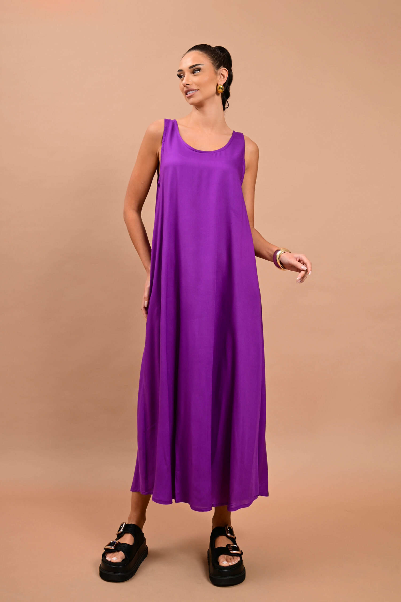 Έχει χαλαρή γραμμή που προσφέρει άνεση και ελευθερία κινήσεων, ενώ το έντονο μοβ χρώμα του προσδίδει ζωντάνια και στυλ. Κατασκευασμένο από ελαφρύ και αέρινο ύφασμα, είναι ιδανικό για τις ζεστές μέρες. Οι φαρδιές τιράντες και η στρογγυλή λαιμόκοψη προσθέτουν μια κομψή πινελιά. Συνδυάστε το με μαύρα σανδάλια με χοντρή σόλα και χρυσά αξεσουάρ για μια μοντέρνα εμφάνιση. Ιδανικό για καθημερινές βόλτες ή βραδινές εξόδους, αυτό το φόρεμα θα γίνει το αγαπημένο σας κομμάτι για αυτή τη σεζόν.